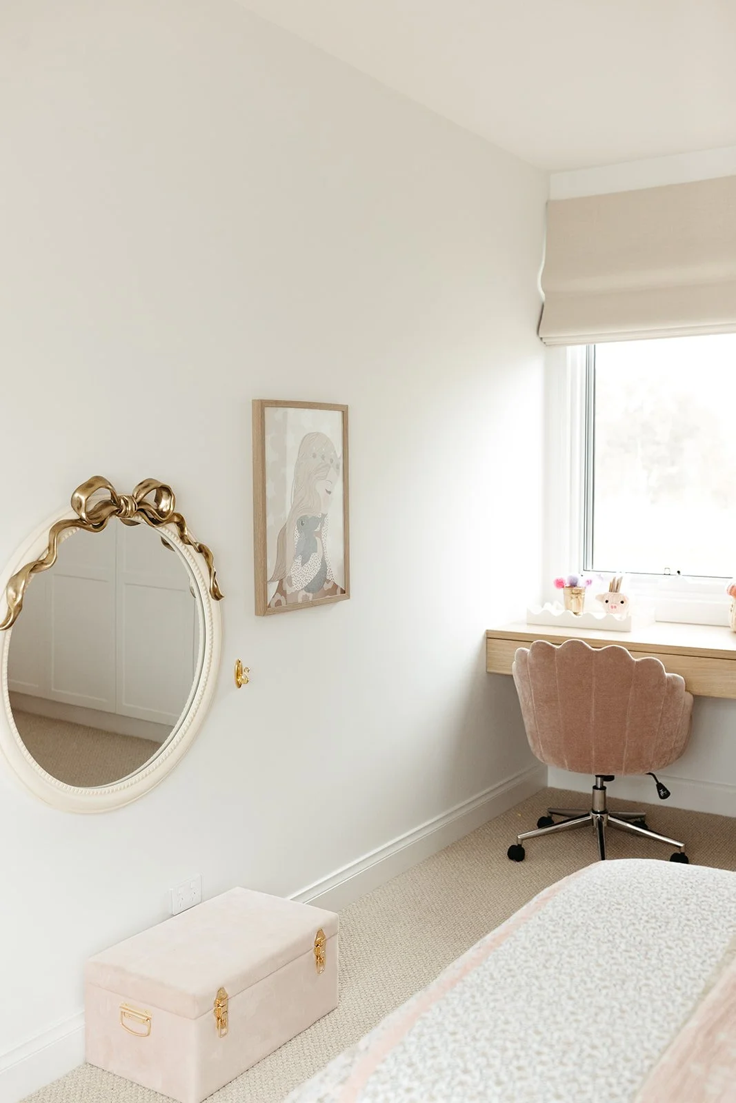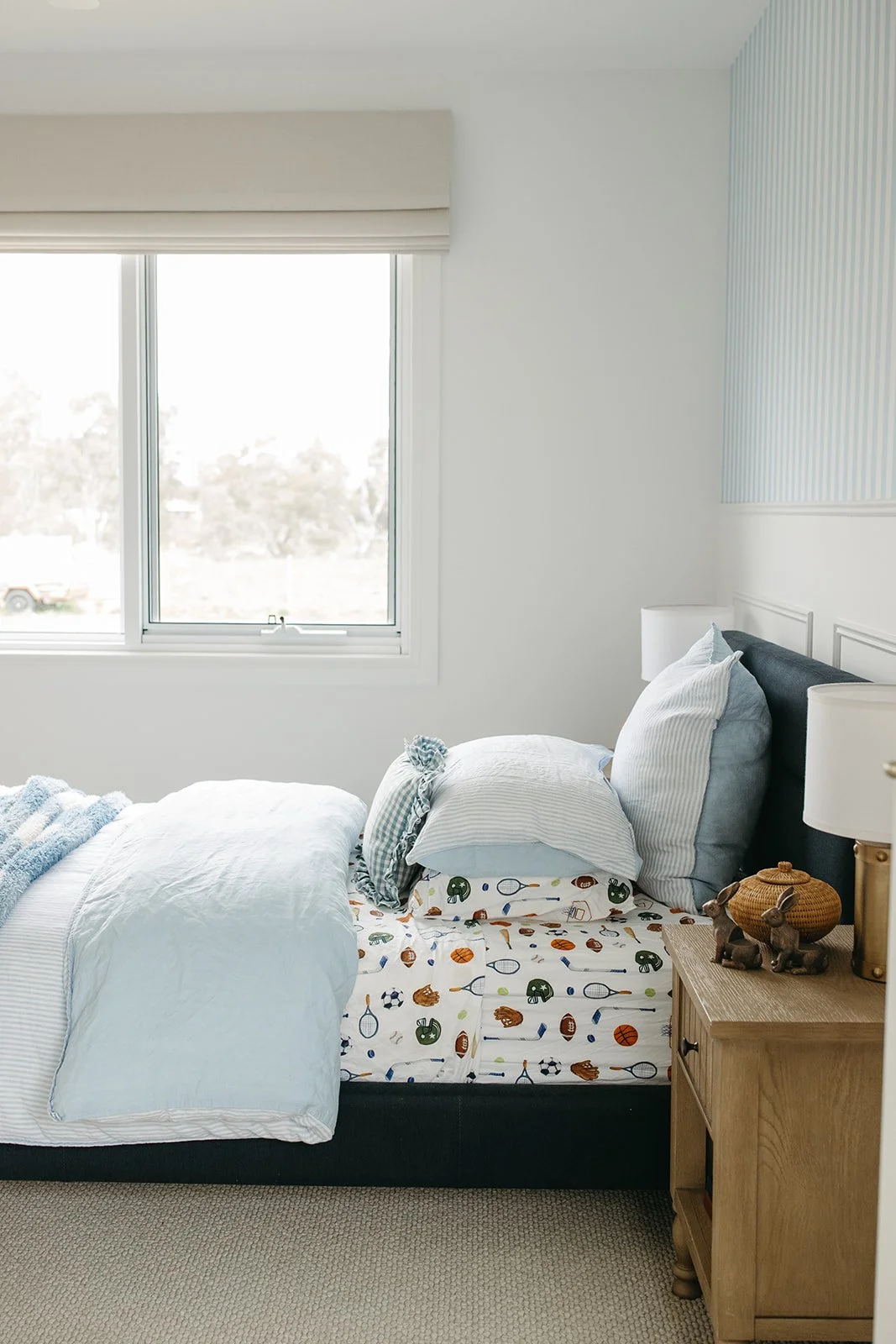 Our kids bedrooms were designed in collaboration with them to bring out the whimsy of childhood. Floral wallpaper and wainscoting for our daughter and blue stripes with wainscoting for our son. Custom cabinetry and Iver Life handles here really make the space, and the built in desks are future proofing for days filled with home work and study that are upcoming.