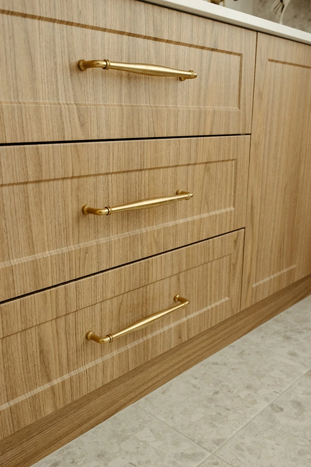 Our bathrooms are similar but not the same, using a warm and cool colour pallate for both spaces to have some differentiation. The warm timber look cabinetry in a floor length gives a traditional feel to it, and we have used both under counter and over mount basins in each space to give it it’s own charm. Wall long shower shelves make an otherwise flat surface interesting and the Phoenix Cromford tapware used throughout is the perfect touch, adding warmth and glow.
