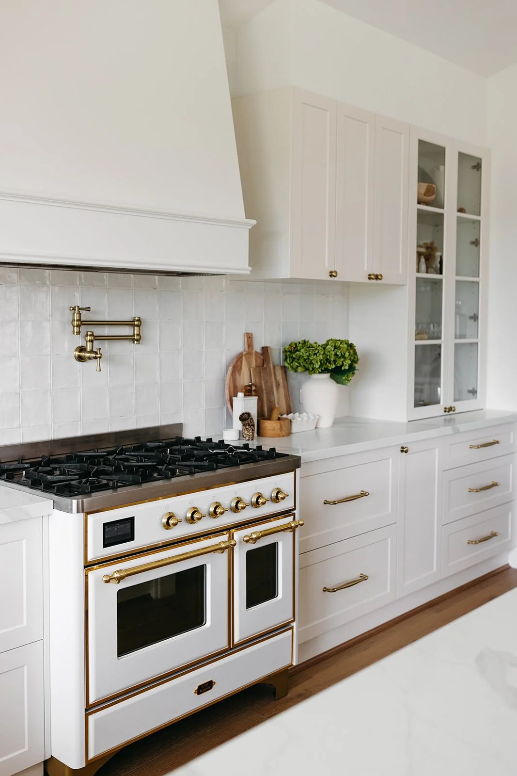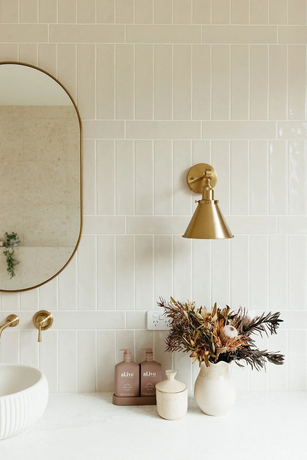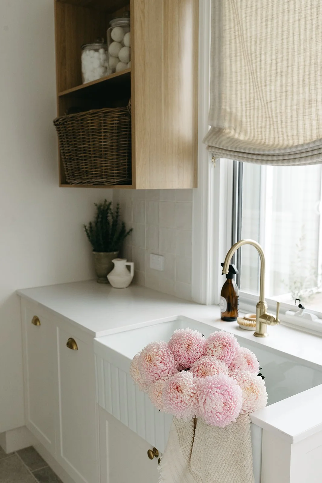 Our kitchen was my most thought out room in the design phase. I wanted something to grow into, something to host Christmas in one day, and again inspired by Utah homes I wanted a butchers block not for cutting but for baking, rolling, setting out glassware - a design choice that was a must for me. It’s not something I see a lot in homes in Australia, but hope to in the future as it adds so much warmth. A custom rangehood above our beautiful brass Ilve oven really centralised our space and is a focal point I am grateful to see every day. The butlers pantry tucked in behind has beautiful diamond formation tiles in grey and white, a classic touch that I added in mid build after removing them from the entryway.